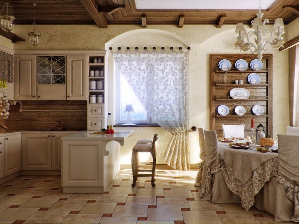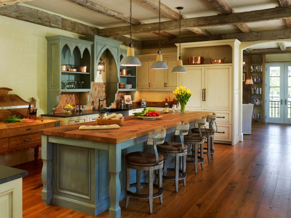 Saat ini, gaya ini paling sering ditemukan dalam tiga versi. Yang paling umum adalah gaya pedesaan Inggris dari dapur. Di ruangan seperti itu adalah mungkin untuk menggunakan semua berkat peradaban modern, hanya untuk menyembunyikan mereka di belakang loker, rak atau fasad. Benda dari kuningan, tembaga, keramik dan tanah liat akan sangat cocok. Plastik atau logam yang mengkilap tidak pada tempatnya di sini.